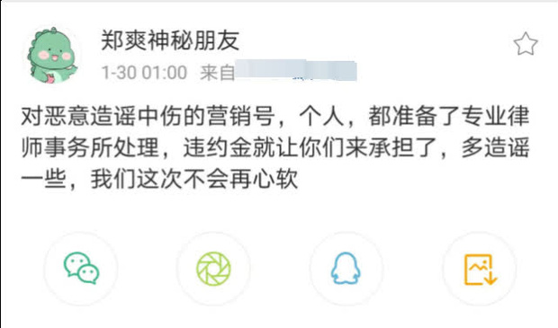 Vậy nhưng, trong một diễn biến khác, trang QQ cho biết một tài khoản trên MXH tự nhận mình là người thân Trịnh Sảng đã đứng ra tố Trương Hằng từng đòi bạn gái phí chia tay lên tới 10 chữ số, tức lên tới hàng tỷ tệ (tương đương khoảng 3600 tỷ đồng). Chủ tài khoản này viết: "Trịnh Sảng không có người 'chống lưng', chỉ một mình đơn thương độc mã, không có lấy 1 ngày được nghỉ ngơi chỉ vì phí 'chuộc thân' trên trời lên tới 10 con số kia".