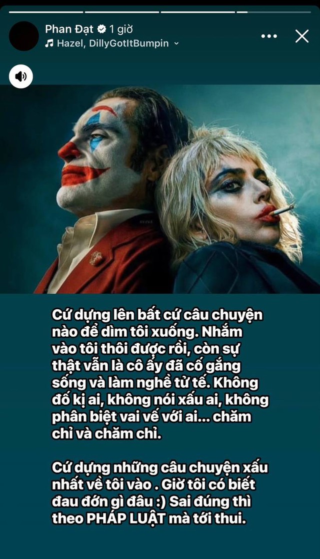 Ở story tiếp theo, Phan Đạt lại viết dòng trạng thái nói tới việc bản thân bị dìm, chèn ép. "Cứ dựng lên bất cứ câu chuyện nào để dìm tôi xuống. Nhắm vào tôi thôi được rồi, còn sự thật vẫn là cô ấy đã cố gắng sống và làm nghề tử tế. Không đố kị ai, không nói xấu ai, không phân biệt vai vế với ai. Chăm chỉ và chăm chỉ. Cứ dựng những câu chuyện xấu nhất về tôi vào. Giờ tôi có biết đau đớn gì đâu", anh cho hay.