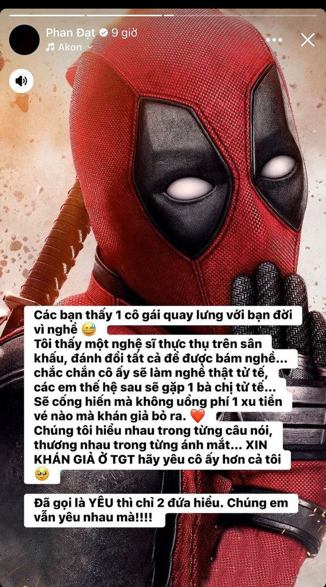 Chắc chắn cô ấy sẽ làm nghề thật tử tế, sẽ cống hiến mà không uổng phí 1 xu tiền vé nào mà khán giả bỏ ra. Chúng tôi hiểu nhau trong từng câu nói, thương nhau trong từng ánh mắt. Xin khán giả hãy yêu cô ấy hơn cả tôi". Cư dân mạng cho rằng người mà Phan Đạt nhắc tới chính là bà xã Phương Lan.