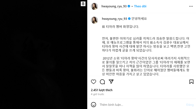Đến ngày 10/11, Hwayoung đăng 1 bài viết dài nhằm phản pháo lại những lời CEO Kim Kwang Soo nói. Hwayoung cho biết cô bị T-ara bạo hành, bắt nạt và chửi bới chứ không hề giả làm nạn nhân. Nữ rapper này đã im lặng suốt 12 năm qua, cô bức xúc vì Kim Kwang Soo khơi lại câu chuyện và biến cô thành nhân vật phản diện. Sau đó, 1 cựu nhân viên Core Contents Media cũng đứng ra làm chứng Hwayoung bị 1 thành viên T-ara đánh.