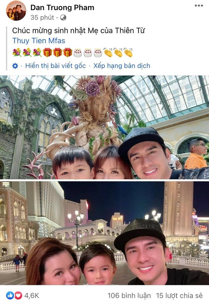 "Chúc mừng sinh nhật mẹ của Thiên Từ", Đan Trường viết. Kèm theo dòng chia sẻ này, Đan Trường cũng đăng kèm bức ảnh anh chụp cùng vợ cũ và con trai.