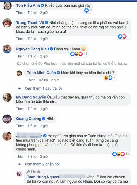 Ở dưới bình luận, nhiều sao Việt như Lưu Thiên Hương, Minh Quân, Bằng Kiều, Thanh Trung... cũng bức xúc thay Tuấn Hưng. Nhiều người cho rằng nên đưa kẻ tráo máy ảnh lên mạng xã hội. Tuy nhiên Tuấn Hưng cho biết nếu anh đưa ảnh kẻ tráo máy ảnh thì vợ con của người đó sẽ khổ. "Tôi cho lên thì vợ con nó ăn cám. Ai làm thì người đó chịu. Cứ để yên xem sao. Đời còn dài", Tuấn Hưng bình luận với một người bạn.