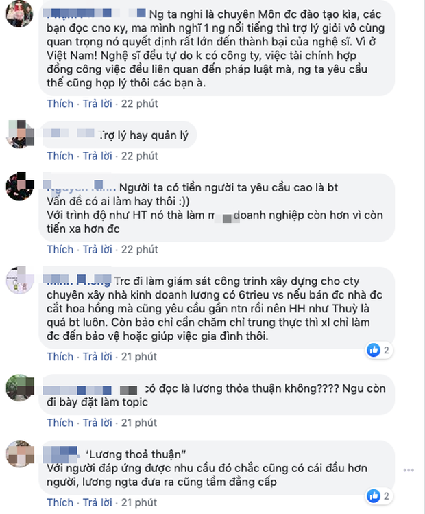 Tuy nhiên, một số người đã từng có kinh nghiệm làm trợ lý cho nghệ sĩ hoặc các công việc có liên quan lại đưa ý kiến bênh vực Hoàng Thuỳ, một dân mạng viết: "Mình đã từng làm trợ lý nghệ sĩ và thấy những yêu cầu này rất bình thường thậm chí là còn khắc khe hơn thế này. Đặc biệt, đã làm trợ lý cá nhân cho celeb thì bắt buộc phải có khả năng ngoại giao cực tốt, ứng biến và xử lý sự cố nhanh nhạy. Yêu cầu cao thì lương cao".