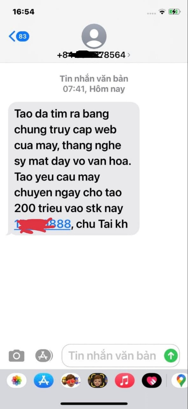 Nội dung thứ nhất là yêu cầu tôi chuyển 200 triệu vào tài khoản cụ thể, của một con người cụ thể, có số điện thoại cụ thể. Nội dung thứ hai, là đưa cho tôi hạn định là đúng 24 giờ. Nếu không chuyển thì mọi chuyện tạm hiểu là toang. Và nội dung thứ ba là, họ đã tìm ra được bằng chứng truy cập web của tôi. Nhưng tôi không làm thì không việc gì phải sợ.