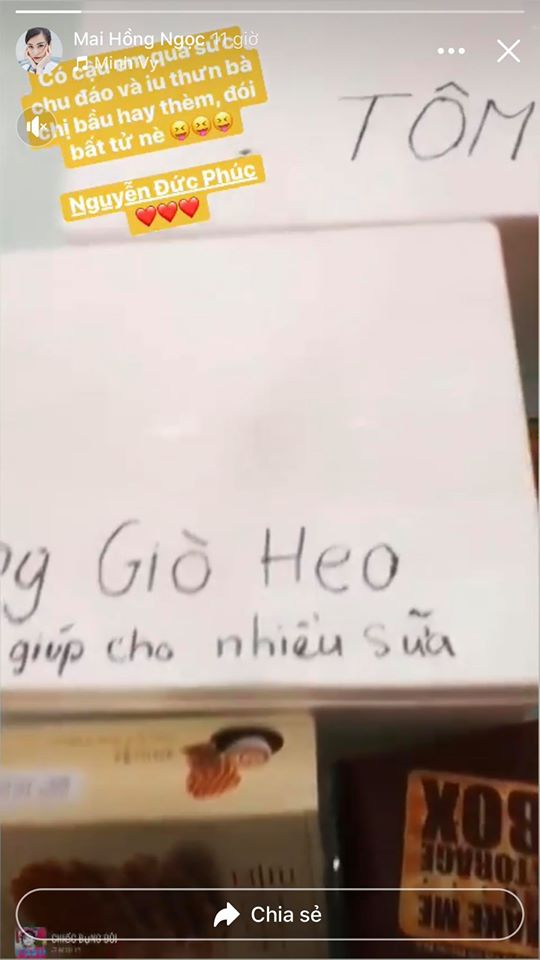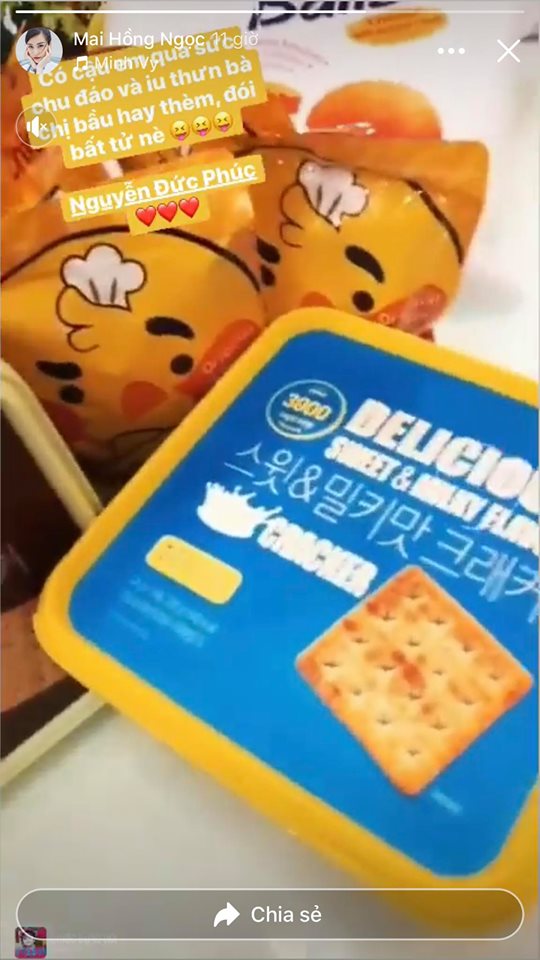 Bên cạnh những lời chúc mừng thì mới đây, Đông Nhi còn khoe một loạt quà do Đức Phúc gửi tặng. Nam ca sĩ "Hơn cả yêu" gửi đến nhà Đông Nhi rất nhiều thực phẩm bổ dưỡng cho bà bầu như móng giò heo, tôm, và cả những đồ ăn vặt Hàn Quốc để mẹ bầu nhâm nhi lúc buồn miệng.