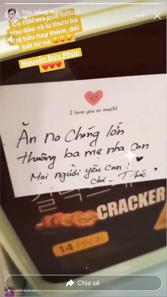 Không chỉ tặng đồ ăn cho Đông Nhi mà Đức Phúc còn để lại lời nhắn rất dễ thương đến em bé trong bụng nữ ca sĩ: "Ăn no chóng lớn, thương ba mẹ nha con. Mọi người yêu con". Nam ca sĩ còn xưng hô là "chú Phúc" một cách rất thân mật, gần gũi.