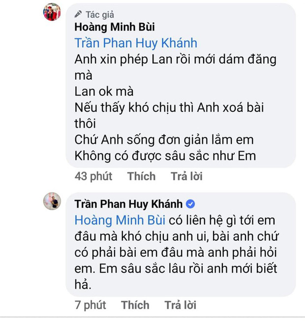 Trước phản ứng không ngờ này, Hoàng Mập nhanh chóng giải thích: "Anh xin phép Lan rồi mới dám đăng mà. Lan ok mà. Nếu thấy khó chịu thì anh xóa bài thôi. Chứ anh sống đơn giản lắm em, không có được sâu sắc như em".
