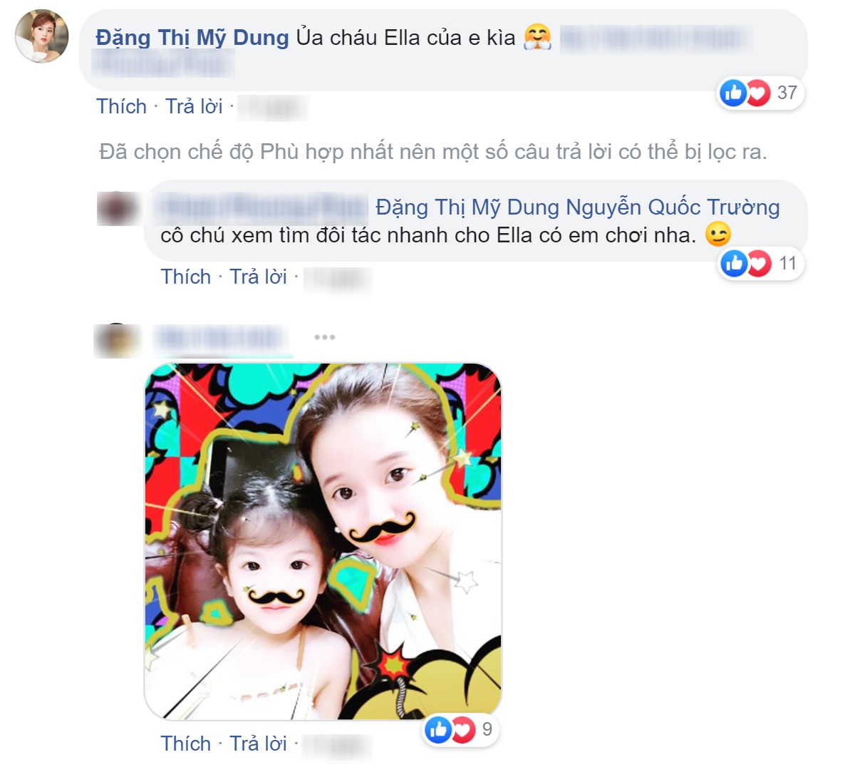 Đáng chú ý, trong số đó có một bé là người quen của Midu tên là Bella. Chính vì thế, nữ diễn viên đã lập tức vào bình luận: "Ủa cháu Bella của em kìa'' và tag một vài người bạn chung của cả hai vào. Người bạn này liền đăng 1 tấm ảnh của Midu cùng bé Bella như xác nhận lời nữ diễn viên nói và đặc biệt để lại bình luận đầy ẩn ý: "Cô chú xem tìm đối tác nhanh cho Bella có em chơi nha."