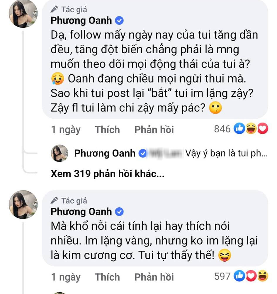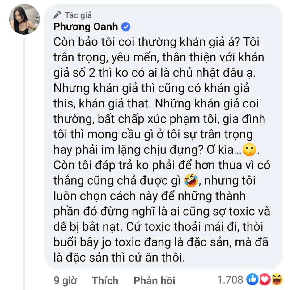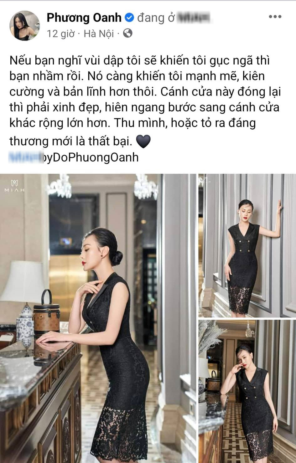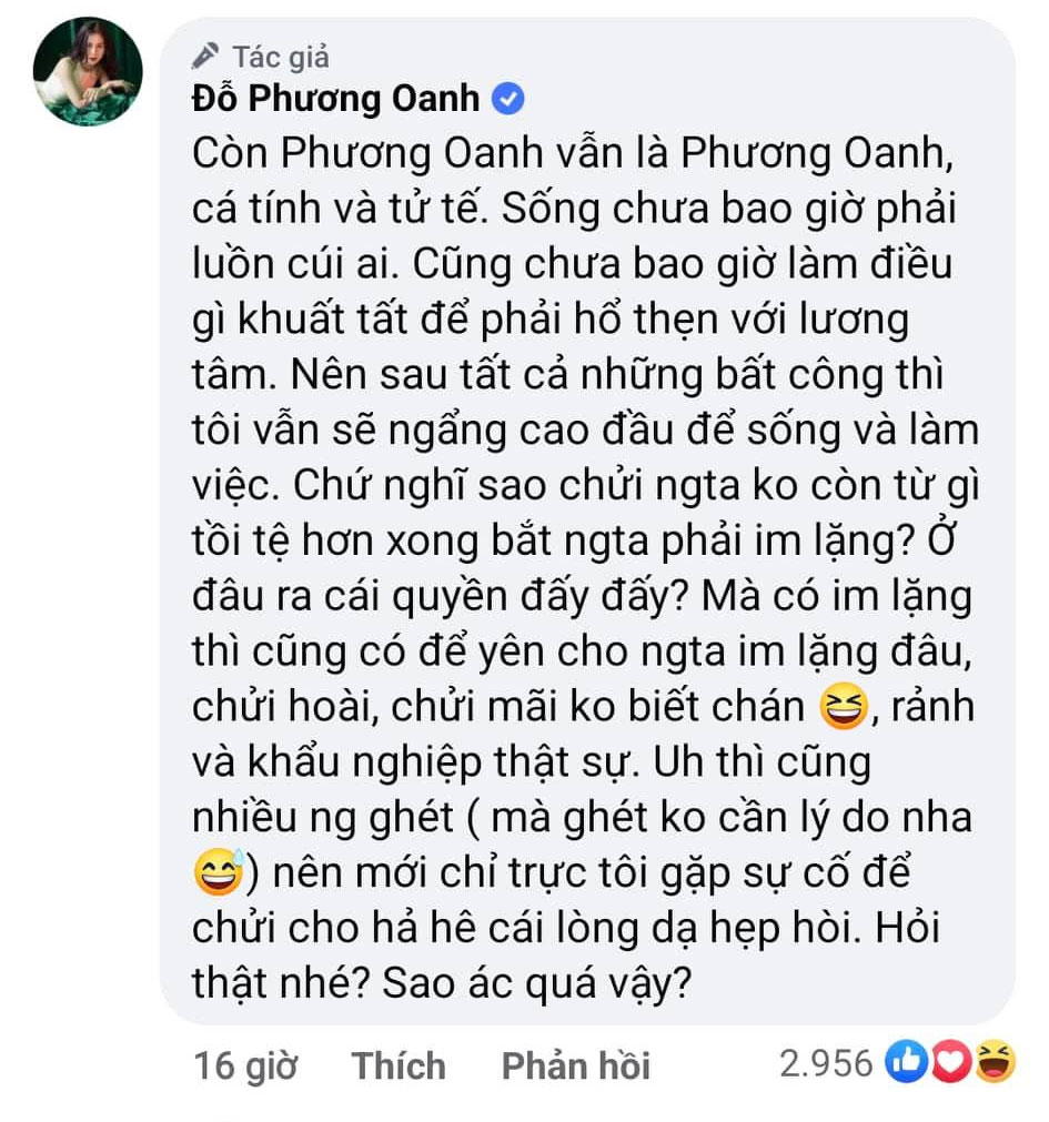 Tuy nhiên, không chiều theo ý kiến số đông, Phương Oanh vẫn liên tục cập nhật những trạng thái úp mở trên mạng xã hội. Thậm chí, dưới phần bình luận của những bài đăng nói trên, người đẹp sinh năm 1989 còn thẳng thừng khẳng định sẽ không bao giờ chịu nhún nhường để những lời chỉ trích, gièm pha ác ý vùi dập mình.