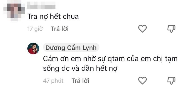 Mới đây nhất, Dương Cẩm Lynh vừa chia sẻ đoạn video mới trên tài khoản Tiktok. Có thể thấy, sau biến cố nợ nần, nữ diễn viên đã dần lấy lại tinh thần ổn định và chăm chỉ làm việc để trả nợ. Bên cạnh những lời động viên, an ủi bà mẹ 2 con thì một netizen đã bình luận: "Trả hết nợ chưa?". Ngay sau đó, nữ diễn viên đã nhanh chóng trả lời lại: "Cảm ơn em. Nhờ sự quan tâm của em chị tạm sống được và dần trả hết nợ".