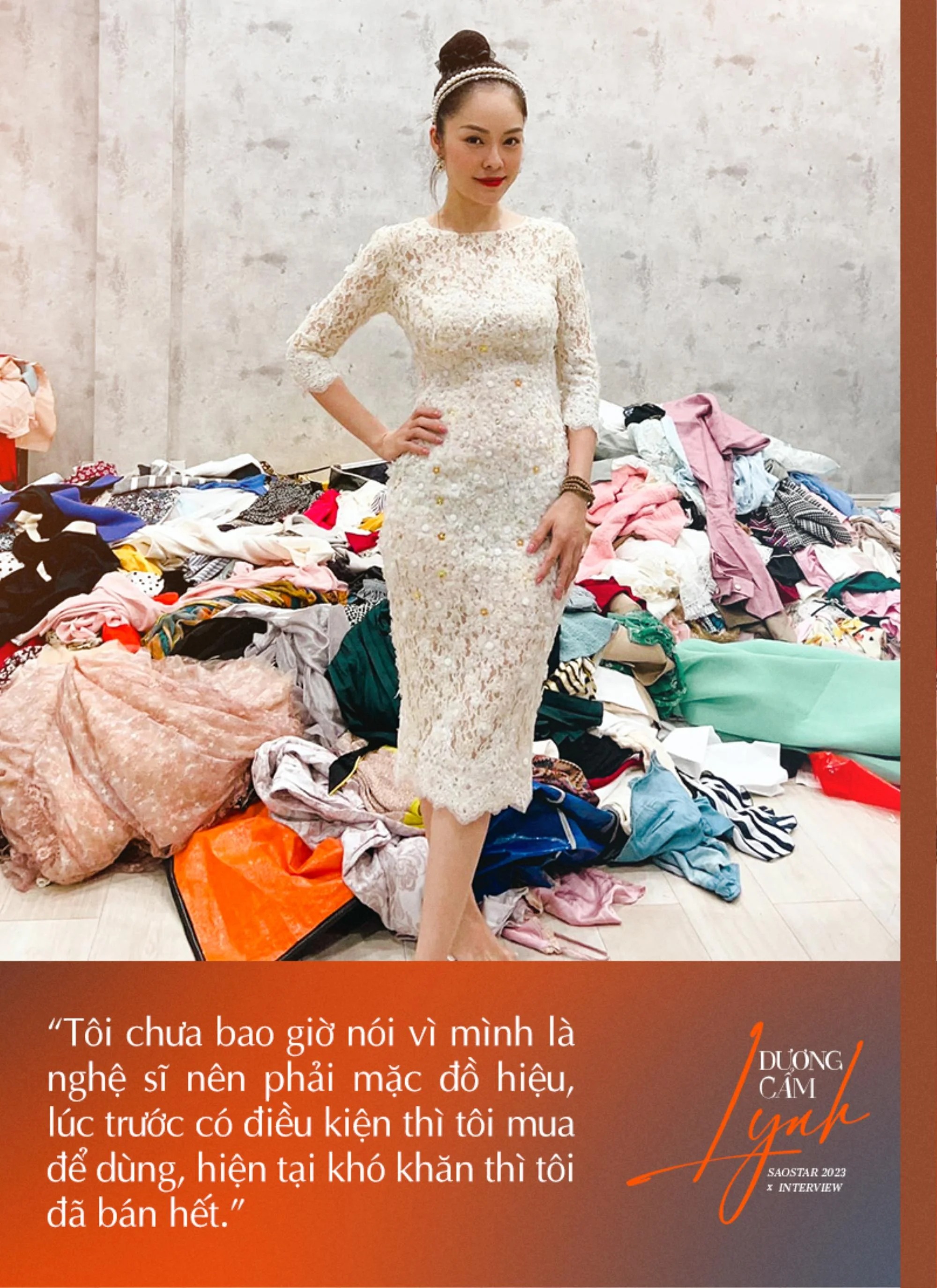 Đúng là tôi bán hết rồi đó, nếu mọi người để ý thì tôi còn có cái túi này thôi nhưng cũng lâu lắm rồi, chắc bán đi cũng không được bao nhiêu đâu. Nếu ai dám mua 10 triệu thì tôi bán luôn nhưng thật sự nó quá cũ và lâu. Nhưng mà quan trọng là người sử dụng nữa... Ví dụ tôi xách vô thì tự nhiên người ta thấy nó đẹp, hay chắc tôi may mắn, cầm gì cũng thấy đẹp. Hoặc trợ lý hay bạn bè tôi cũng chọc “Trời ơi Lynh nó mặc bộ đồ 200 nghìn vô cũng thấy giống như mắc tiền” (Cười to). Chắc là cái duyên mặc đồ của tôi nữa. Thú thật là tôi bán rất là nhiều, bán hết tất cả rồi.