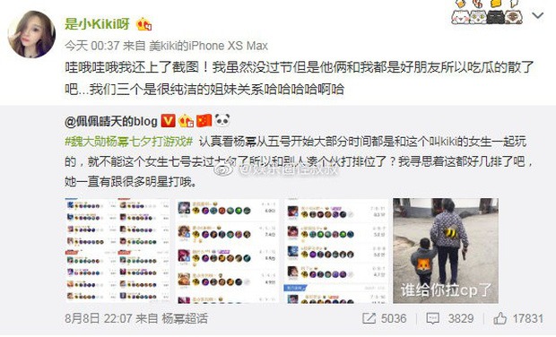 Giữa muôn trùng thông tin, nick chính chủ "Tiểu Kiki" đã lên tiếng cho biết, mối quan hệ giữa cô, Dương Mịch và Ngụy Đại Huân chỉ là... chị em tốt mà thôi. Lời chia sẻ này mang ý phủ nhận tin đồn cô là Angela Baby, đồng thời còn gián tiếp làm rõ việc giữa Dương Mịch và mỹ nam kém tuổi không có quan hệ "nhập nhằng" như nhiều fan vẫn nghĩ.