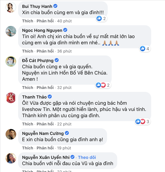 Chỉ sau đó ít phút, Võ Lê Thành Vinh - con trai ruột NS Hoài Linh đã thay đổi ảnh trên trang cá nhân thành ảnh chụp cùng ông nội, đính kèm biểu tượng khóc. Bên dưới bài đăng, rất nhiều sao Việt và netizen đã gửi lời chia buồn tới gia quyến của anh.