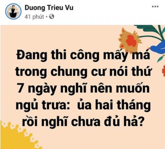 Trên trang cá nhân, Dương Triệu Vũ viết: "Đang thi công mấy má trong chung cứ nói thứ 7 ngày nghỉ nên muốn ngủ trưa: Ủa hai tháng rồi nghỉ chưa đủ hả?". Đặc biệt với câu nói "ủa hai tháng rồi nghỉ chưa đủ hả" của Dương Triệu Vũ cũng gây bức xúc trong dư luận, khi nam ca sĩ ám chỉ việc hai tháng người dân phải ở nhà do đại dịch Covid-19. Tuy nhiên đến hiện tại, Dương Triệu Vũ đã xóa chia sẻ gây nhiều tranh cãi trên.