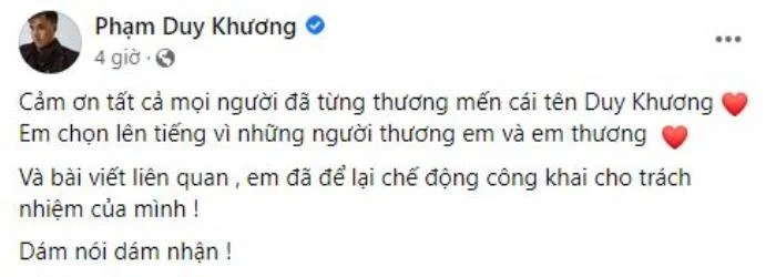 Mới đây nhất, Duy Khương đã chính thức lên tiếng về sau ồn ào "đá xéo" huấn luyện viên cũ. Cụ thể, nam diễn viên bày tỏ trên trang cá nhân: "Cảm ơn tất cả mọi người đã từng thương mến cái tên Duy Khương. Em chọn lên tiếng vì những người thương em và em thương. Và bài viết liên quan, em đã để lại chế động công khai cho trách nhiệm của mình! Dám nói dám nhận!".