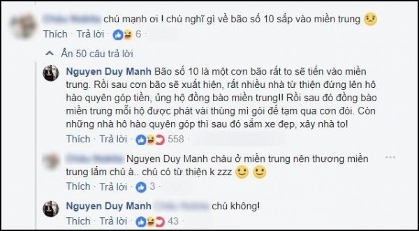 Tuy nhiên, trái với số đông, nam ca sĩ Duy Mạnh - người nổi tiếng với nhiều phát ngôn “gây sốc” lại có quan điểm khá khác biệt về việc kêu gọi từ thiện. Anh viết: “Bão số 10 là một cơn bão rất to sẽ tiến vào miền trung. Rồi sau cơn bão sẽ xuất hiện, rất nhiều nhà từ thiện đứng lên hô hào quyên góp tiền, ủng hộ đồng bào miền trung!
