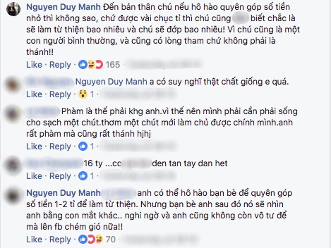 Duy Mạnh cho rằng việc kêu gọi quyên góp từ thiện với số tiền quá lớn dễ dẫn đến khó minh bạch tài chính, trong khi lòng tham con người lại là “vô đáy”. |