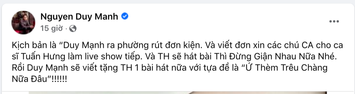 Ca sĩ Duy Mạnh viết trên trang cá nhân: "Kịch bản là 'Duy Mạnh ra phường rút đơn kiện. Và viết đơn xin cho ca sĩ Tuấn Hưng làm liveshow tiếp. Và Tuấn Hưng sẽ hát bài Thì Đừng Giận Nhau Nữa Nhé. Rồi Duy Mạnh sẽ viết tặng Tuấn Hưng một bài hát nữa với tựa đề là Ứ Thèm Trêu Chàng Nữa Đâu!".