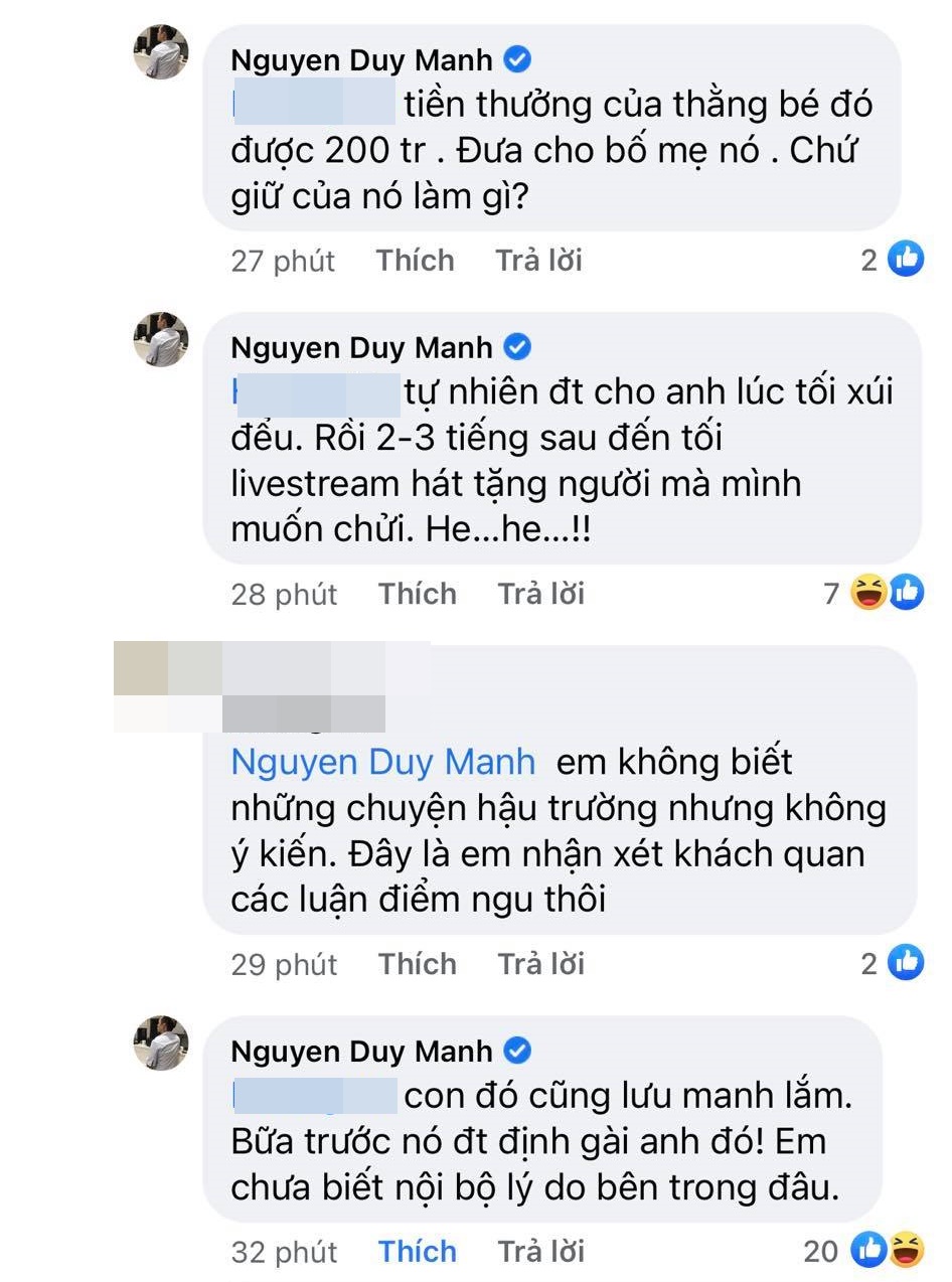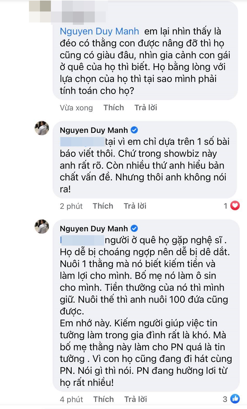Mới đây, ca sĩ Duy Mạnh cũng đã tham gia bày tỏ ý kiến về vụ lùm xùm này. Trong đoạn bình luận với một cư dân mạng, Duy Mạnh cho rằng tiền thưởng 200 triệu quán quân Vietnam Idol Kids của Hồ Văn Cường nên đưa cho bố mẹ ruột giữ.