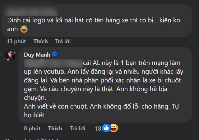 Trước thắc mắc của fan, Duy Mạnh nhanh chóng lên tiếng phản hồi rằng: “Cái AL này là 1 bạn trên mạng làm up lên Youtube. Anh lấy đăng lại và nhiều người khác lấy đăng lại. Và bên nhà phân phối xác nhận là xe bị chuột gặm. Câu chuyện này là thật. Anh không hề bịa chuyện. Anh viết về con chuột. Anh không đổ lỗi cho hãng. Tự họ biết”.