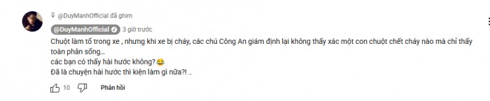 “Chuột làm tổ trong xe, nhưng khi xe bị cháy, các chú Công An giám định lại không thấy xác một con chuột chết cháy nào mà chỉ thấy toàn phân sống. Các bạn có thấy hài hước không? Đã là chuyện hài hước thì kiện làm gì nữa?!”, Duy Mạnh bình luận dưới MV lyrics Bố chuột.