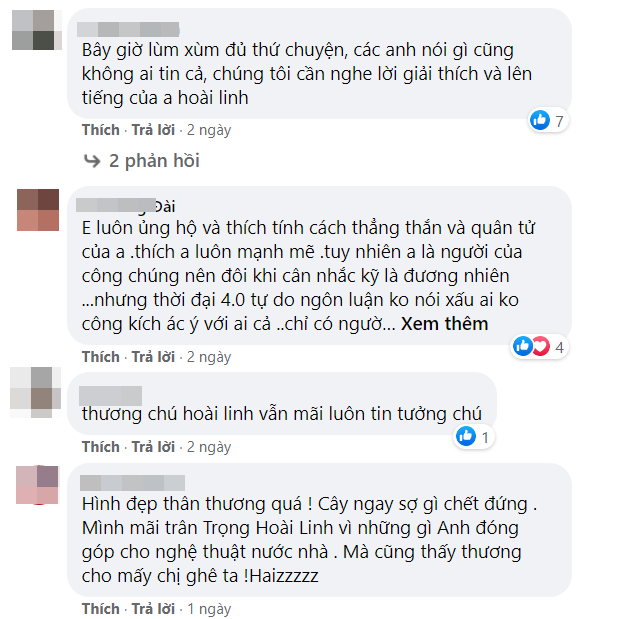 Dưới bài đăng, nhiều cư dân mạng cũng gửi lời động viên tới NS Hoài Linh và gia đình, bày tỏ sự tin tưởng tới nam danh hài. Bên cạnh đó, cũng có những khán giả yêu cầu Hoài Linh lên tiếng nói rõ để sự việc được minh bạch.