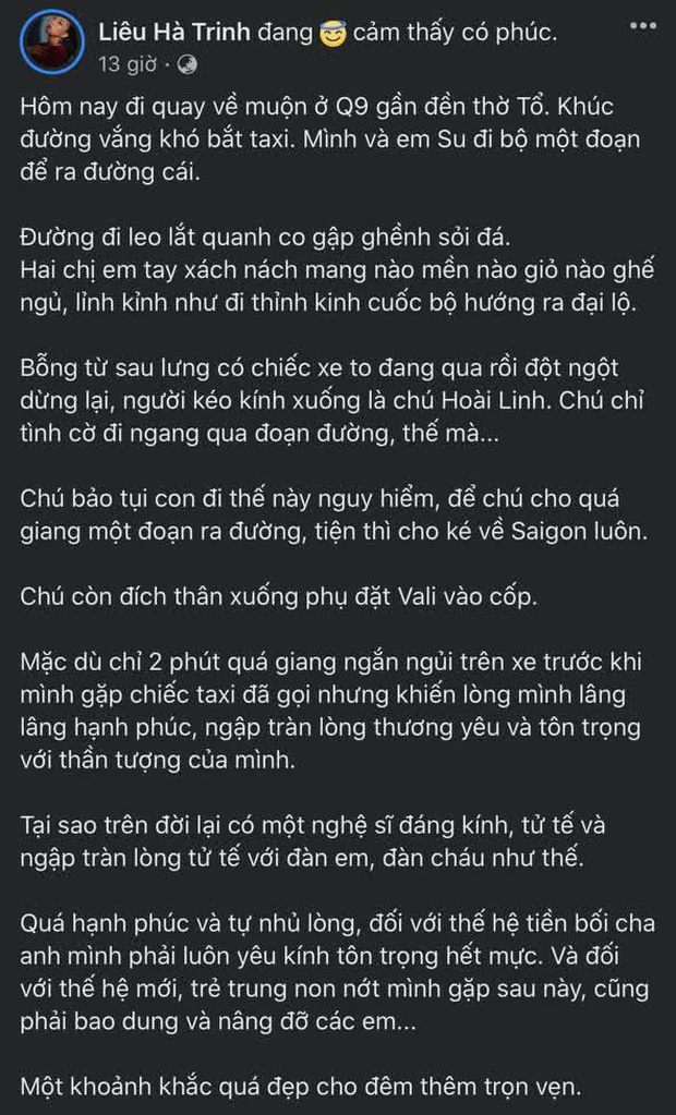Mới đây, MC Liêu Hà Trinh vừa chia sẻ lên trang cá nhân câu chuyện đáng nhớ với NS Hoài Linh, thu hút sự quan tâm của đông đảo khán giả. Theo đó, khi quay xong một chương trình vào tối muộn, cô và người bạn phải đi bộ một đoạn đường rất dài trong khi tay xách nách mang nhiều đồ đạc lỉnh kỉnh. Đúng lúc này, xe của danh hài Hoài Linh đi qua, vì lo lắng nên nam nghệ sĩ đã dừng xe hỏi thăm, ngỏ ý cho Liêu Hà Trinh đi nhờ, thậm chí còn đích thân xuống phụ cô đặt vali vào cốp.