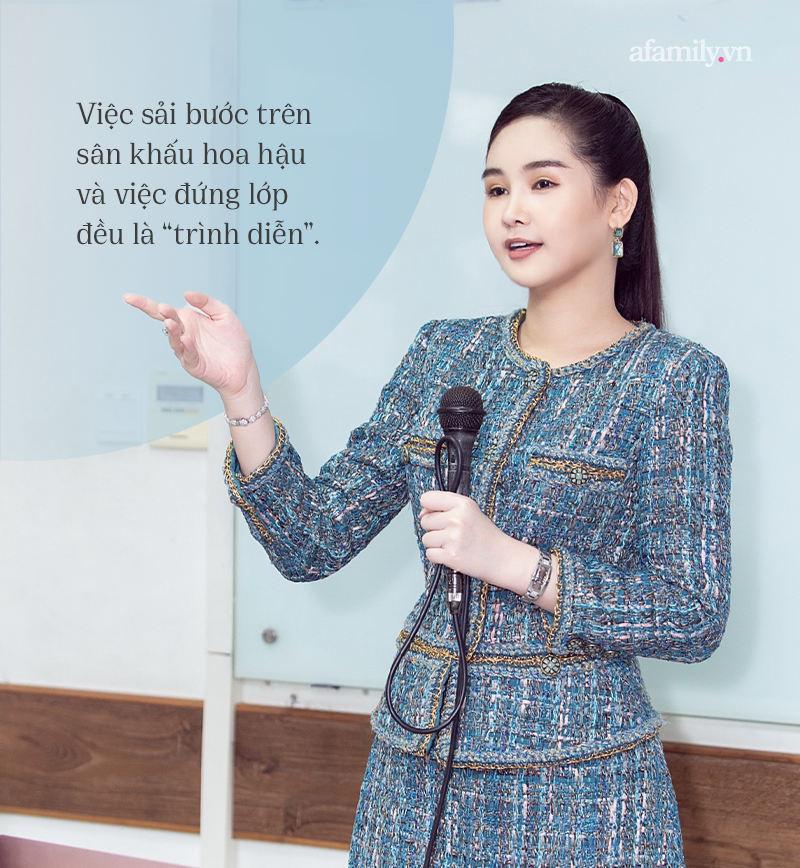 Có thể nói việc sải bước trên sân khấu hoa hậu và việc đứng lớp đều là “trình diễn” những gì mình muốn truyền tải qua hành động và lời nói với mục tiêu là chinh phục cảm xúc của từng đối tượng “khán giả”. Với sân khấu thi hoa hậu, đối tượng khán giả chú ý và đánh giá mình qua vẻ bên ngoài nhiều hơn, còn trong lớp học hẳn nhiên điều các em mong đợi ở tôi vẫn là ở nội dung và tính ứng dụng từ bài học mà các em sẽ tiếp thu được.