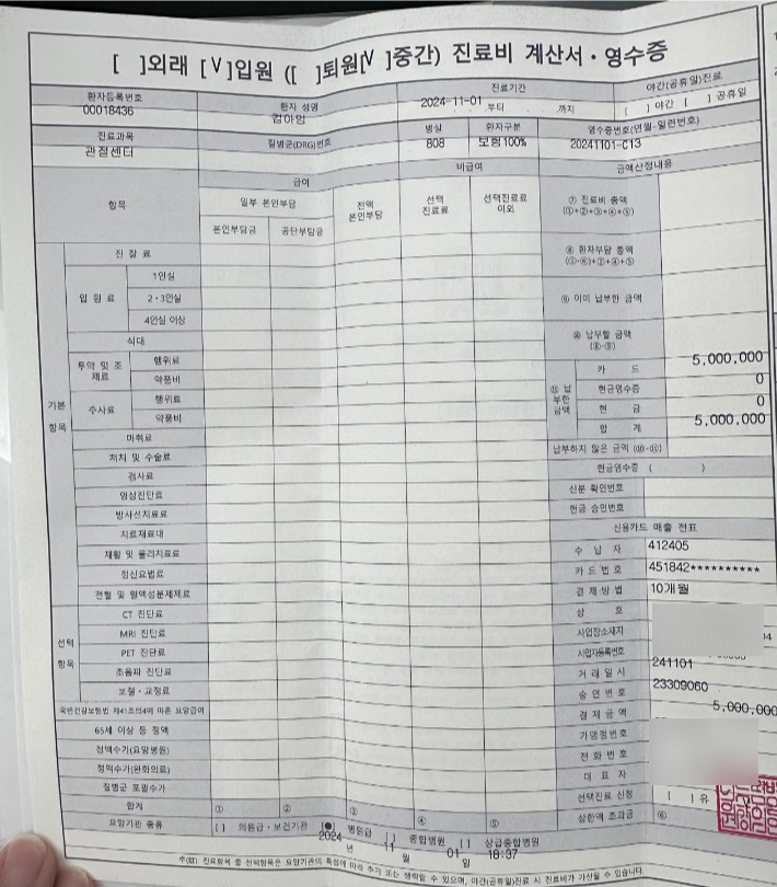 Tổng cộng 5,4 triệu won (94 triệu đồng) được thanh toán nhưng từng hóa đơn lại không có chi tiết, nhìn giống như kiểu lừa đảo thẻ tín dụng (giả vờ mua đồ bằng thẻ tín dụng, sau đó nhận lại tiền mặt). Với bệnh nhân được bảo hiểm chi trả 100%, phí xử lý vết thương chỉ khoảng 200.000-400.000 won (3,4 - 6,8 triệu đồng) là cùng. Gia đình Kim Sae Ron vẫn tự chi trả những khoản này. Dù có làm phẫu thuật thẩm mỹ không thuộc diện bảo hiểm thì cũng chỉ tốn tối đa 1 - 2 triệu won (17,4, - 34,8 triệu đồng) là cùng. Mức chi không hợp lý chút nào" - Ông Kwon Young Chan chỉ ra.