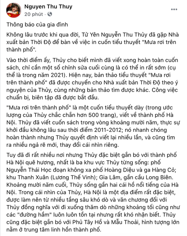 Trên Facebook cá nhân được Hoa hậu Thu Thuỷ sử dụng lúc sinh thời, đại diện người nhà cho biết sẽ tiếp tục công tác in ấn cuốn tiểu thuyết Mưa Rơi Trên Thành Phố để xuất bản theo đúng nguyện ước trước đây của người quá cố. Nói về tiến độ thực hiện tâm nguyện của cố Hoa hậu Nguyễn Thu Thuỷ, người nhà thổ lộ: "Vào thời điểm ấy, Thủy cho biết mình đã viết xong hoàn toàn cuốn sách, chỉ cần một số chỉnh sửa cuối cùng là có thể in rất sớm (cụ thể là trong năm 2021). Hiện nay, bản thảo tiểu thuyết Mưa Rơi Trên Thành Phố đã được chuyển cho Nhà xuất bản Thời Độ theo ý nguyện của Thủy, cùng những bản thảo tìm được khác. Công việc chuẩn bị, biên tập đã được bắt đầu".