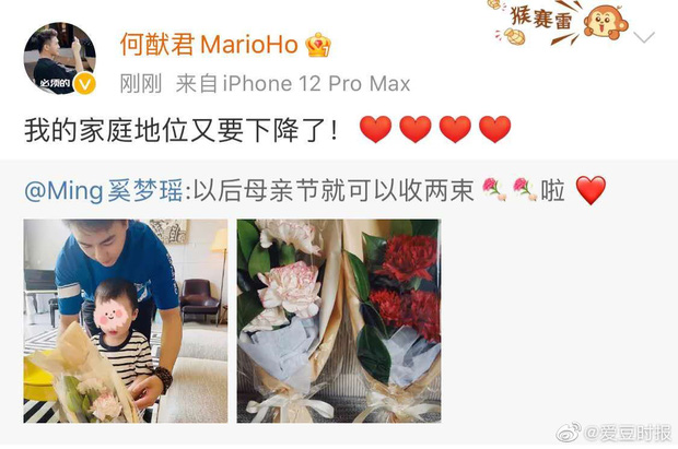 Trên Weibo, Ming Xi chia sẻ hình ảnh ông xã cùng cậu con trai nhỏ Ronaldo tặng bó hoa xinh xắn cùng dòng nhắn: "Sau này cứ tới Ngày của Mẹ là tôi có thể nhận được 2 bó rồi".