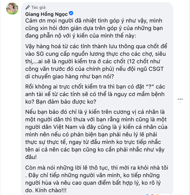 Giữa thời điểm dịch bệnh tại TP.HCM đang vô cùng căng thẳng, 1 số nghệ sĩ đã có hành động đẹp khi ra tay tương trợ những người khó khăn tuy nhiên không ít người lại vướng phải vụ lùm xùm không đáng có. Gần đây nhất, đạo diễn Nguyễn Quang Dũng bị phản đối đến mức phải khoá luôn Facebook cá nhân vì đề xuất Cảnh sát giao thông (CSGT) làm shipper giữa mùa dịch. Không chỉ khán giả, Giang Hồng Ngọc cũng đăng status dài và thể hiện thái độ cực bức xúc về đề xuất vô lý trên.