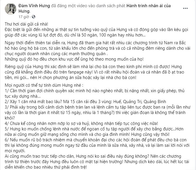 Cách đây ít giờ, nam ca sĩ khẳng định lại lần nữa: "Hưng sẽ chính thức ngưng vĩnh viễn việc kêu gọi đóng góp như 20 năm qua đã từng làm. Sẽ không chuyển giùm ai, không đại diện ai. Quý vị có thể tìm các hội đoàn hay cá nhân khác để đóng góp thiện ý của mình giùm Hưng. Còn Hưng nếu có làm thì sẽ tự làm theo tiền cá nhân mình và bạn bè thân thiết gom lại với nhau có bao nhiêu thì làm bấy nhiêu. Có duyên gặp được hoàn cảnh nào thương tâm thì giúp trực tiếp và cũng không cần ai biết hay nêu tên. Nên số tài khoản từ thiện của Hưng sẽ được thu hồi lại. Mong mọi người không gửi, không đóng góp gì vào nữa nhé".