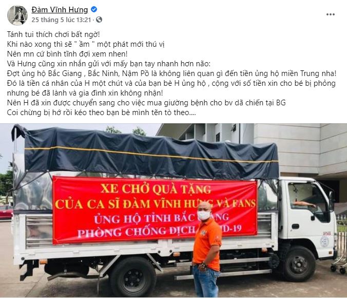 Giữa lúc dân tình đang xôn xao bàn tán về lùm xùm này, ca sĩ Đàm Vĩnh Hưng đã có những chia sẻ gây chú ý về vấn đề làm từ thiện. Được biết, thời gian này Đàm Vĩnh Hưng đang dốc sức hỗ trợ 2 tỉnh được coi là điểm nóng Covid-19 Bắc Giang và Bắc Ninh. Cả 2 địa phương này đều đang gặp rất nhiều khó khăn khi bệnh viện dã chiến lập ra lại không đủ giường chiếu, cần có sự trợ giúp về y tế từ các tỉnh lân cận trong khi số lượng ca nhiễm liên tục tăng lên. Đàm Vĩnh Hưng đã gửi tiền mặt để mua 1000 chiếc giường bệnh cùng rất nhiều thực phẩm, đồ bảo hộ nhằm giảm bớt phần nào áp lực cho các cơ sở y tế tại 2 tỉnh trên.