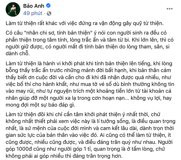 "Làm từ thiện thì chưa có gì gọi là vĩ đại để tung hô, ngưỡng mộ, để 'đánh bóng tên tuổi'. Từ thiện lẽ ra nên được xem là một điều bình thường trong cuộc sống. Nếu người làm từ thiện mà như 'sao buổi sớm', như 'lá mùa thu' thì đáng buồn biết bao. Nhưng một người dám đứng ra vận động quyên góp từ thiện thì rất đáng ngưỡng mộ. Người làm từ thiện thì nhiều nhưng dám đứng ra vận động gây quỹ từ thiện thì rất ít", Bảo Anh bộc bạch.