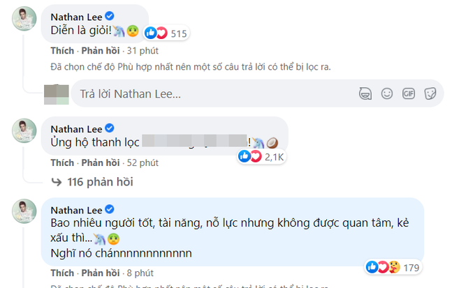 Nathan Lee tiếp lời: "Chỉ diễn là giỏi! Bao nhiêu người tốt, tài năng, nỗ lực nhưng không được quan tâm. Kẻ xấu thì... Nghĩ nó chán!". Nam ca sĩ còn bày tỏ sự ủng hộ cho việc thanh lọc lại giới showbiz Việt giống như Cbiz vừa trải qua.