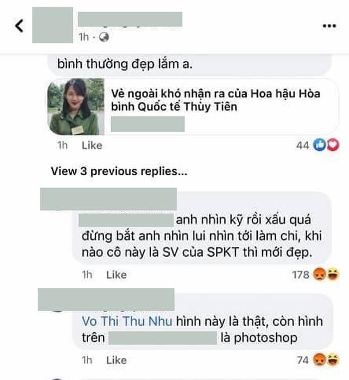 Chưa dừng lại ở đó, người này còn liên tục phỉ báng người đẹp sinh năm 1998: "Không hiểu ban giám khảo có mù không sao mà chọn Hoa hậu gì xấu dữ vậy", "Tôi nhìn kỹ rồi, xấu quá, đừng bắt tôi nhìn tới nhìn lui làm chi".