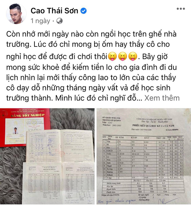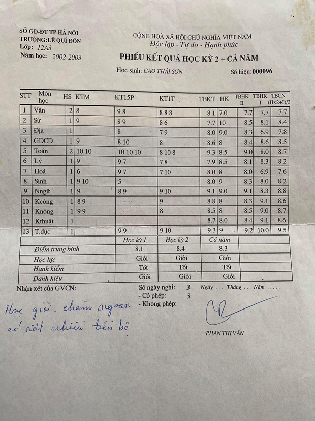 Trong không khí rộn ràng của kỳ thi tốt nghiệp THPT quốc gia, rất nhiều nghệ sĩ đã hướng về các sĩ tử sinh năm 2003. Bên cạnh những lời động viên, đây cũng là dịp các sao Việt hồi tưởng lại thời còn đi học. Mới đây, Cao Thái Sơn cũng gây chú ý khi tiết lộ bảng điểm của mình khi còn ngồi trên ghế nhà trường. Theo chia sẻ, nam ca sĩ từng là học sinh chuyên khối A trường Lê Quý Đôn, Hà Nội.