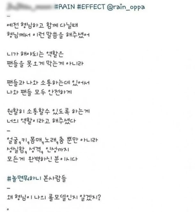 Cụ thể, người này viết: "Khi tôi làm việc với Bi Rain, anh ấy đã nói với tôi điều này: 'Nhiệm vụ của cậu không phải là ngăn người hâm mộ tiến về phía anh. Nhiệm vụ của cậu là đảm bảo rằng anh và người hâm mộ có thể nói chuyện với nhau một cách an toàn và suôn sẻ'.