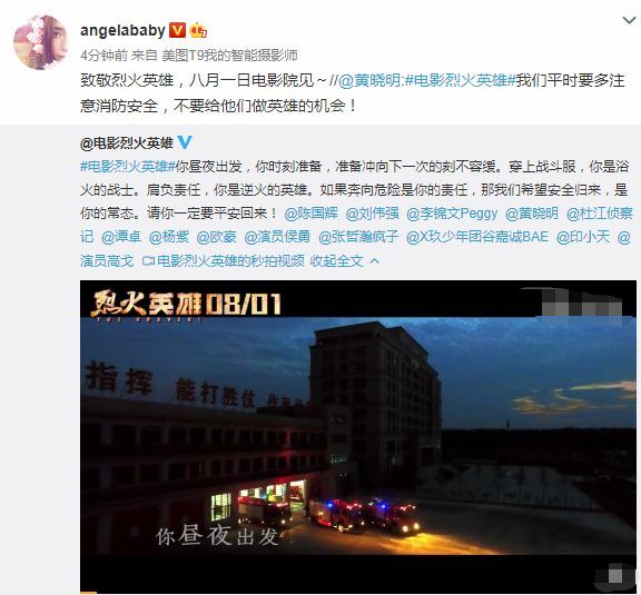 Thời gian gần đây, Huỳnh Hiểu Minh đang tập trung quảng bá cho phim mới "Liệt hỏa anh hùng". Thế nhưng, việc Angela Baby không có động tĩnh gì để ủng hộ ông xã khiến cô bị trích là thờ ơ, lạnh nhạt, không quan tâm đến chồng cũng như tác phẩm mới của anh. Trong khi nam tài tử họ Huỳnh liên tục nhắc đến vợ thì Angela Baby lại hoàn toàn im lặng và chỉ tập trung vào công việc của mình cũng như bé Bọt Biển Nhỏ.