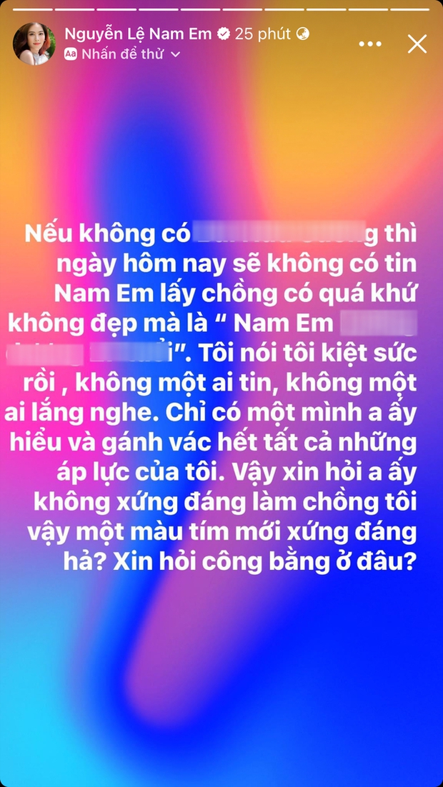 Kể từ khi công khai mối quan hệ, chuyện tình giữa Nam Em và chồng sắp cưới nhận được sự quan tâm lớn của cư dân mạng. Bên cạnh những lời chúc phúc, người đẹp gốc Tiền Giang phải đối mặt với không ít "sóng gió" chỉ vì chuyện đời tư của "nửa kia". Trên các diễn đàn MXH xuất hiện những thông tin hôn phu của Nam Em từng có 2 vợ, 3 con và quá khứ ồn ào. Trước những ý kiến trái chiều, Nam Em có động thái cứng rắn, liên tục lên tiếng bảo vệ chồng sắp cưới.