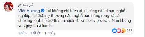 Trước những ý kiến trái chiều, nghệ sĩ Việt Hương tiếp tục có lời chia sẻ: "Tôi không chỉ trích ai. Ai cũng có tai nạn nghề nghiệp. Tôi thật sự thương cảm nghề bán hàng rong và có chương trình hỗ trợ thật, tại dịch chưa thực hiện được. Nên không bình luận gây hiểu lầm gì". Tấm lòng nhân ái của nữ danh hài đã nhận được rất nhiều cảm tình của công chúng.