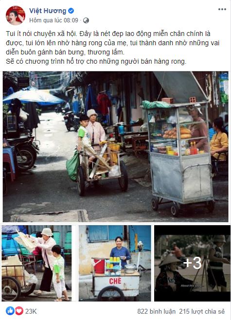 Mới đây, trên trang cá nhân, nghệ sĩ Việt Hương vừa có động thái gây chú ý khi chia sẻ loạt khoảnh khắc cô hóa thân thành người bán hàng rong trong một dự án phim ảnh kèm theo dòng chú thích: "Tôi ít nói chuyện xã hội. Đây là nét đẹp lao động miễn chân chính là được. Tôi lớn lên nhờ hàng rong của mẹ, tôi thành danh nhờ những vai diễn buôn gánh bán bưng, thương lắm. Sẽ có chương trình hỗ trợ cho những người bán hàng rong".