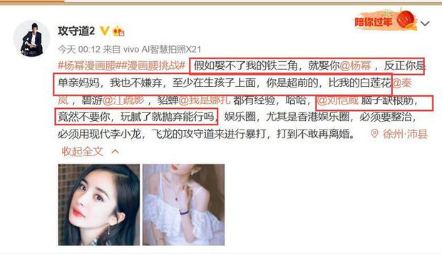 Trang BJH đưa tin, trong lúc tình thế đang hết sức rối ren, một nhân vật khác bất ngờ chiếm trọn sự quan tâm và chú ý của netizen khi đăng bài viết cầu hôn Dương Mịch. Trên MXH, người này chia sẻ ảnh của Dương Mịch kèm lời nhắn thông thiết: "Tôi muốn cưới Dương Mịch, Cho dù cô ấy là người mẹ đơn thân, tôi cũng không cảm thấy nề hà. Ít nhất về chuyện con cái, em vẫn là người đi trước, có kinh nghiệm hơn cả những mỹ nhân trong lòng anh như Tần Lam, Giang Sơ Ảnh, Cổ Lực Na Trát. Đúng là Lưu Khải Uy có vấn đề, chơi đùa chán rồi nên vứt bỏ em đúng không?".