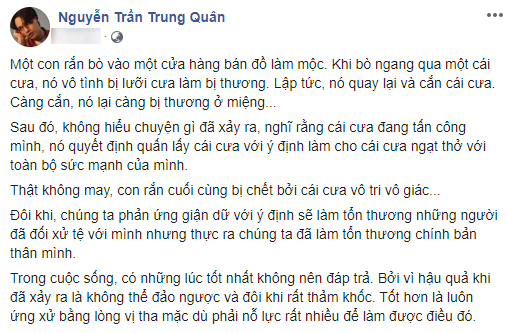 Mới đây, nam ca sĩ Nguyễn Trần Trung Quân - người bạn cực kỳ thân thiết với Denis Đặng đã bất ngờ đăng tải một dòng trạng thái đầy ẩn ý lên trang cá nhân giữa lúc lùm xùm của chàng giám đốc sáng tạo vẫn chưa kịp lắng xuống.