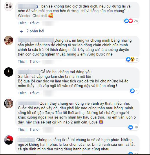 Mặc dù không trực tiếp nhắc đến ai nhưng mọi người đều hiểu Nguyễn Trần Trung Quân đang lên tiếng để bảo vệ Denis Đặng giữa lùm xùm đạo nhái của cậu bạn thân. Bên dưới bình luận, người hâm mộ của hai anh chàng liên tục để lại những lời động viên, an ủi và khuyên rằng cả hai không nên lên tiếng thêm nữa, hãy im lặng sửa sai và chứng minh cho khán giả thấy mình hoàn toàn có thể tự đứng trên đôi chân của mình.