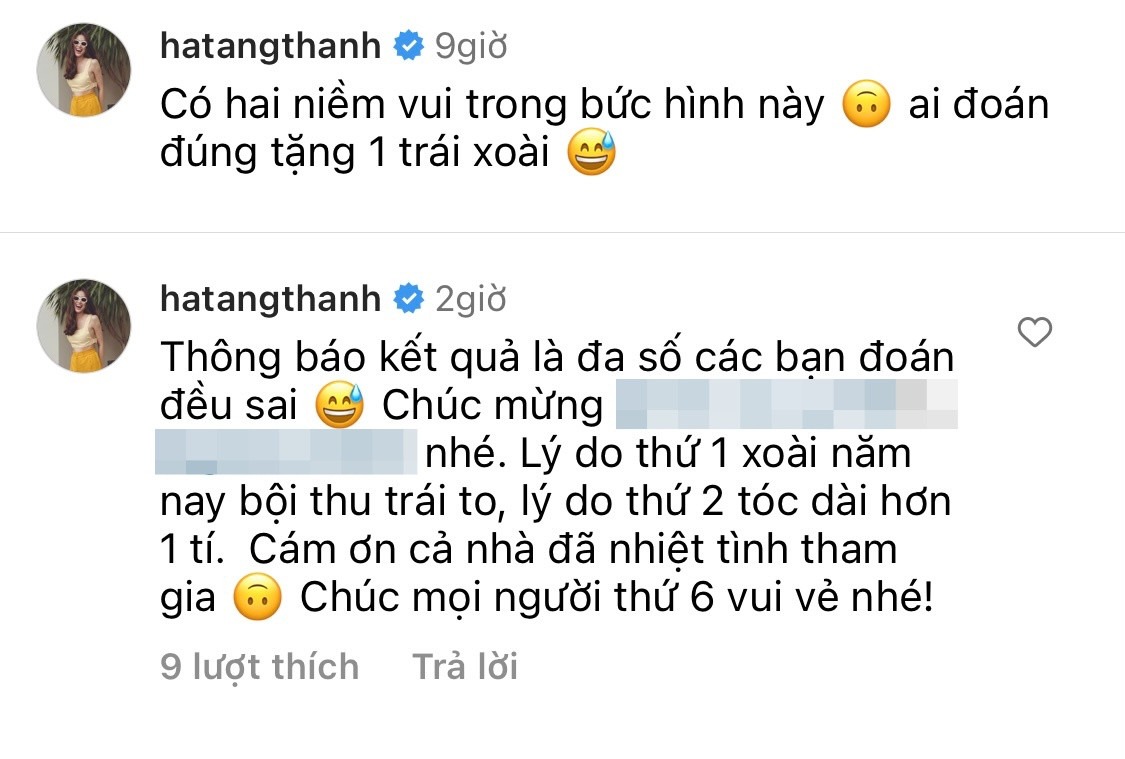 Giữa nghi vấn đang có em bé, Hà Tăng đã nhanh chóng lên tiếng đính chính 2 "niềm vui". Cụ thể, mẹ bỉm ba con viết: "Thông báo kết quả là đa số các bạn đoán đều sai. Lý do thứ nhất là xoài năm nay bội thu trái to, lý do thứ 2 là tóc dài hơn 1 tí. Cảm ơn cả nhà đã nhiệt tình tham gia". Theo đó, bà xã doanh nhân Louis Nguyễn cho biết 2 "niềm vui" mà cô đề cập đến chính là xoài bội thu và tóc dài hơn, không liên quan đến chuyện bầu bí.