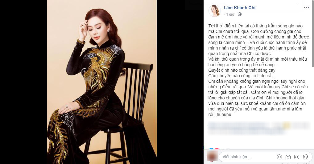Quyết định nào cũng thật đắng cay. Câu chuyện nào cũng có lí do cả. Chi cần khoảng không gian nghỉ ngơi suy nghĩ cho những điều trải qua. Và cuối tuần này Chi sẽ có câu trả lời giải đáp tất cả. Cám ơn vì mọi người đã lo lắng cho chuyện của gia đình Chi khoảng thời gian vừa qua. Hiện tại sức khoẻ Khánh Chi đã ổn, cám ơn mọi người đã yêu mến và quan tâm. Nhớ nhà lắm rồi...".