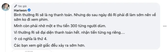 Hari Won còn cho biết: "Bình thường Ri sẽ là người thanh toán. Nhưng do sau ngày đó Ri phải đi làm sớm nên về sớm không đi xem phim. Mình còn phải nhờ một em thu tiền 300 từng người dùm. Vì thường Ri sẽ đại diện thanh toán hết. Nhận tiền từng người riêng... 수 có nghĩa là thứ 4. Các bạn xem giờ giấc đều xảy ra sớm hơn".