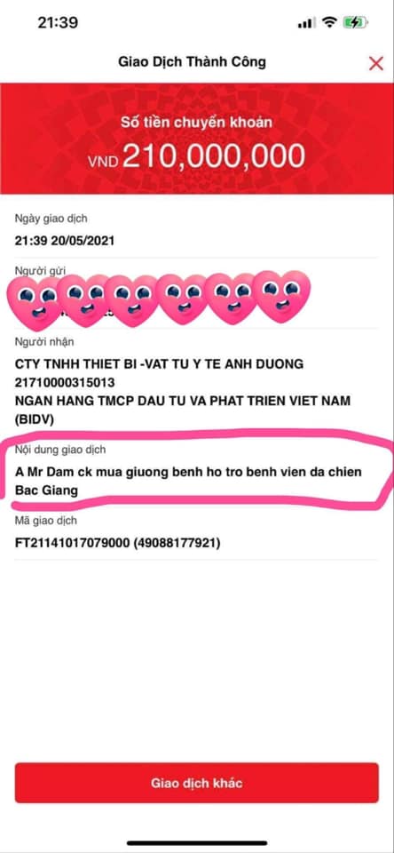 Cho đến ngày 20/5, Đàm Vĩnh Hưng tiếp tục cập nhật tin vui, cho biết vật phẩm mà anh rao bán để lấy tiền hỗ trợ chống dịch hiện đã có người mua, đồng thời số tiền mua giường bệnh dù cao hơn giá ban đầu anh cũng sẵn sàng bỏ tiền túi ra bù vào cho đủ. Như vậy, nam ca sĩ đã hoàn tất việc chuyển 210 triệu đồng để mua giường ủng hộ bệnh viện dã chiến tại Bắc Giang.